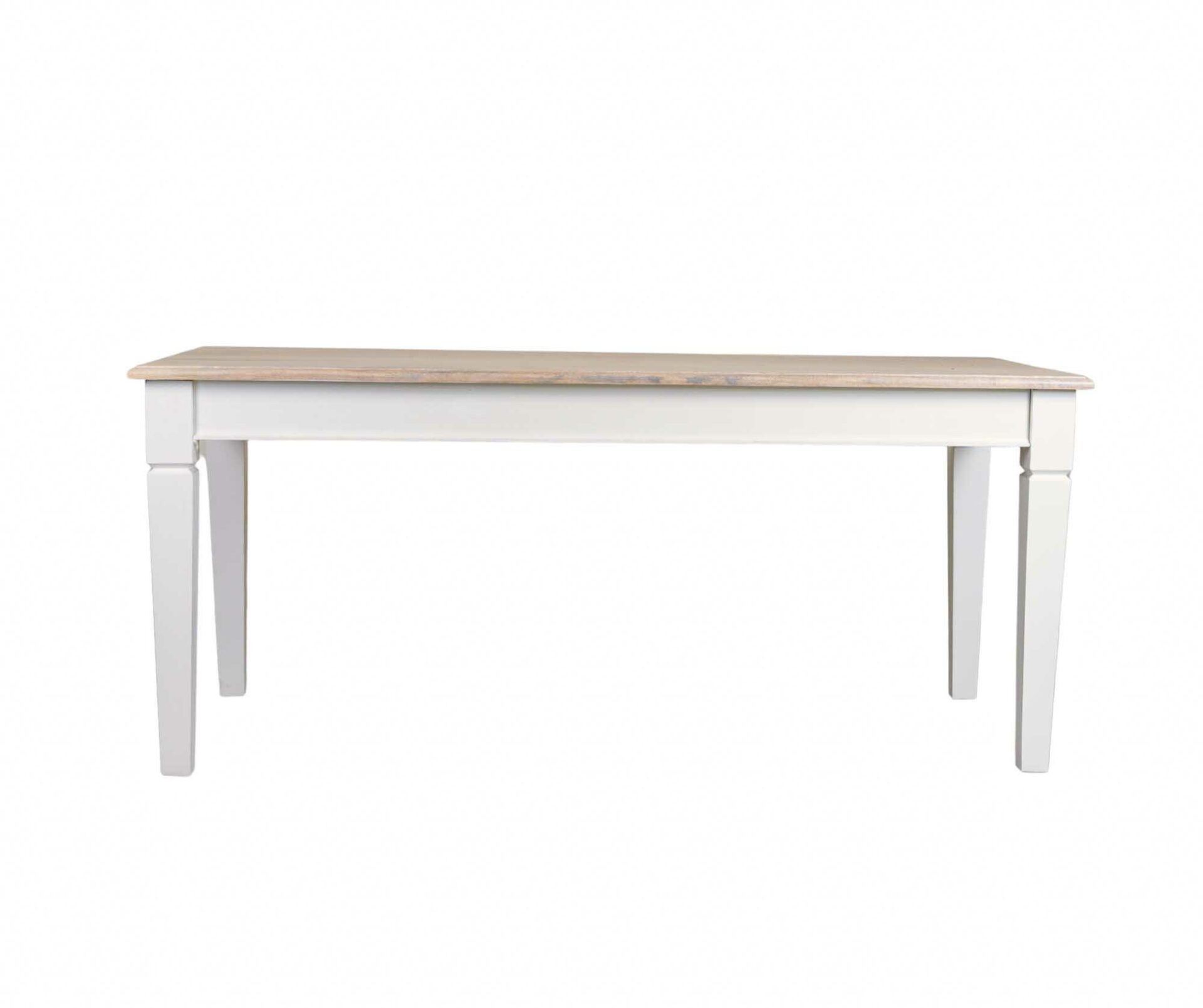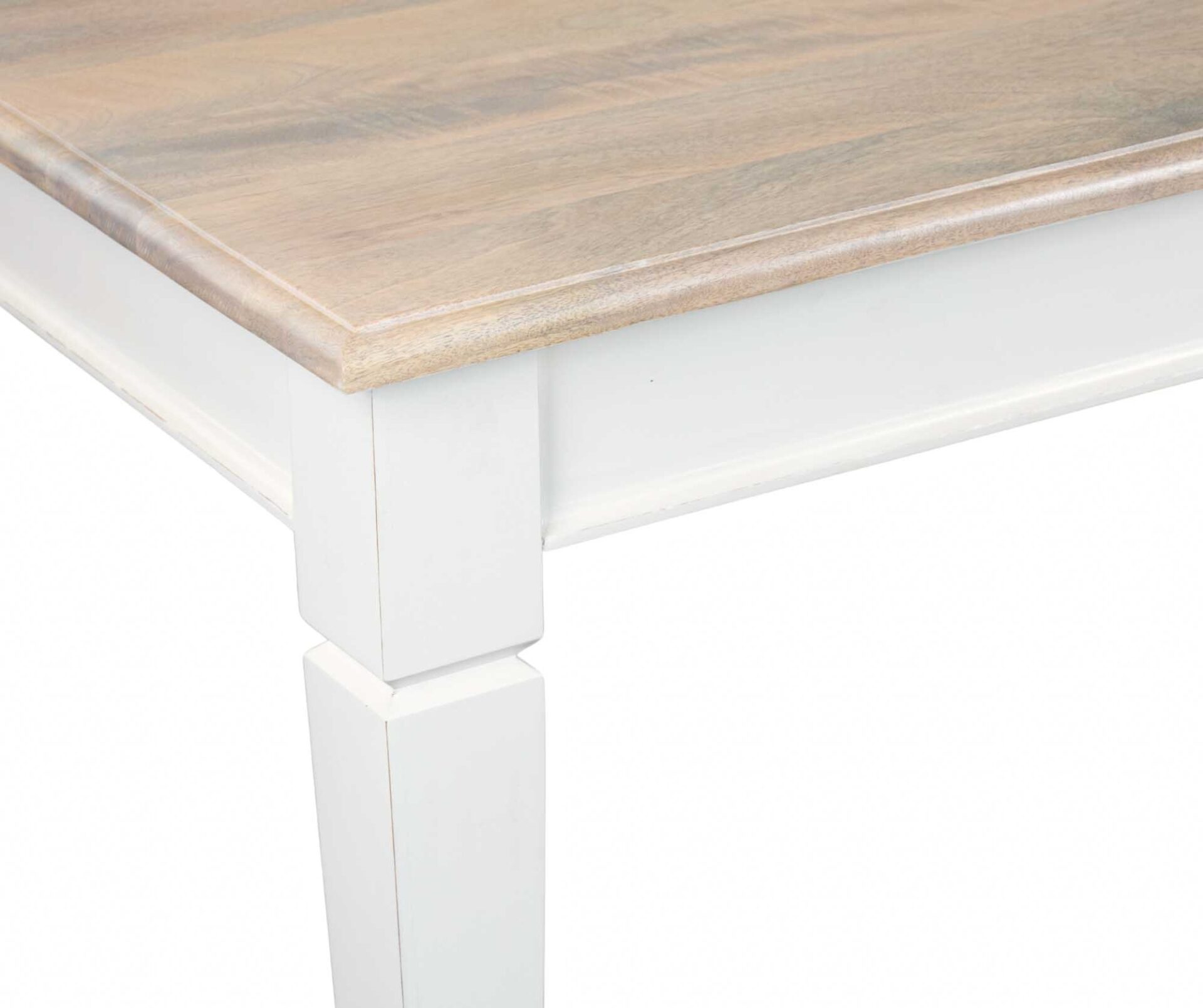 Prostokątny stół w kolorze antycznej bieli. Blat z drewna mango został pobielony oraz zaimpregnowany olejem. Elementy bielone charakteryzują się niejednolitą kolorystyką przenikających się szarości oraz bladego różu. Szkielet stołu stanowią nogi z drewna akacjowego, z widocznymi dekoracyjnymi wcięciami.